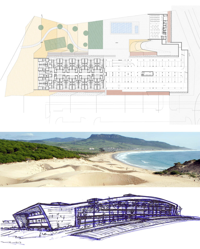 Proyecto y construcción de apartahotel de lujo con un emplazamiento único: la cima de un acantilado en las costas de Cádiz. La forma del edificio simula el viento y el mar del entorno, adaptándose para tratar de ser lo menos agresivo posible, dado la naturaleza que le rodea.